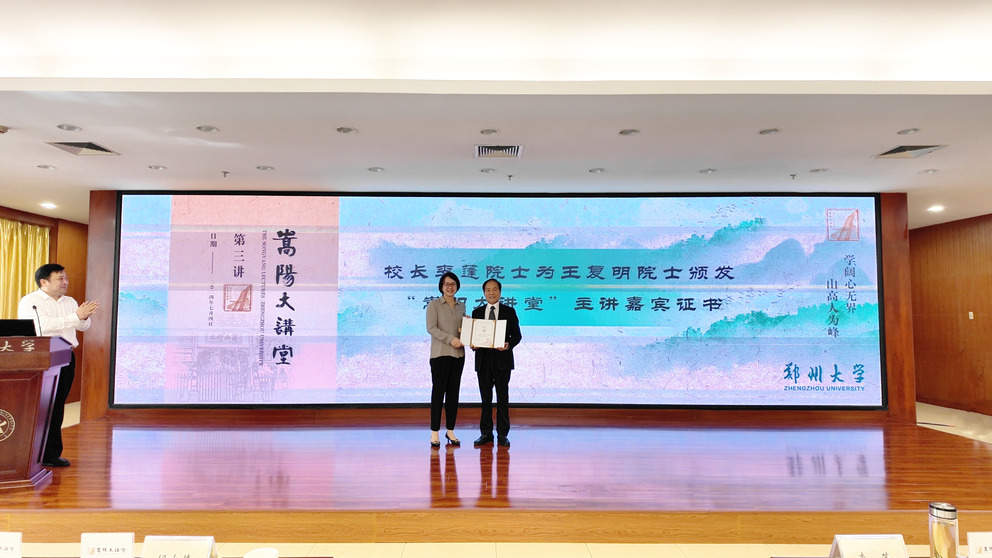 李蓬为王复明院士颁发“嵩阳大讲堂”主讲嘉宾证书