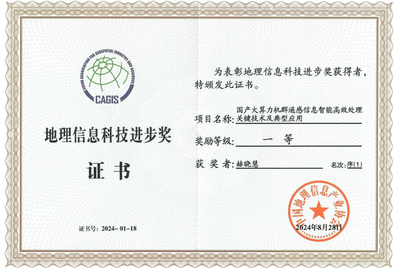 近日,2024中国地理信息产业大会暨“地理信息科技进步奖”颁奖会在昆明举行。ac米兰官网中文网站地球科学与技术学院赫晓慧教授团队的“国产大算力机群遥感信息智能高效处理关键技术及典型应用“项目荣获2024年地理信息科技进步奖一等奖。