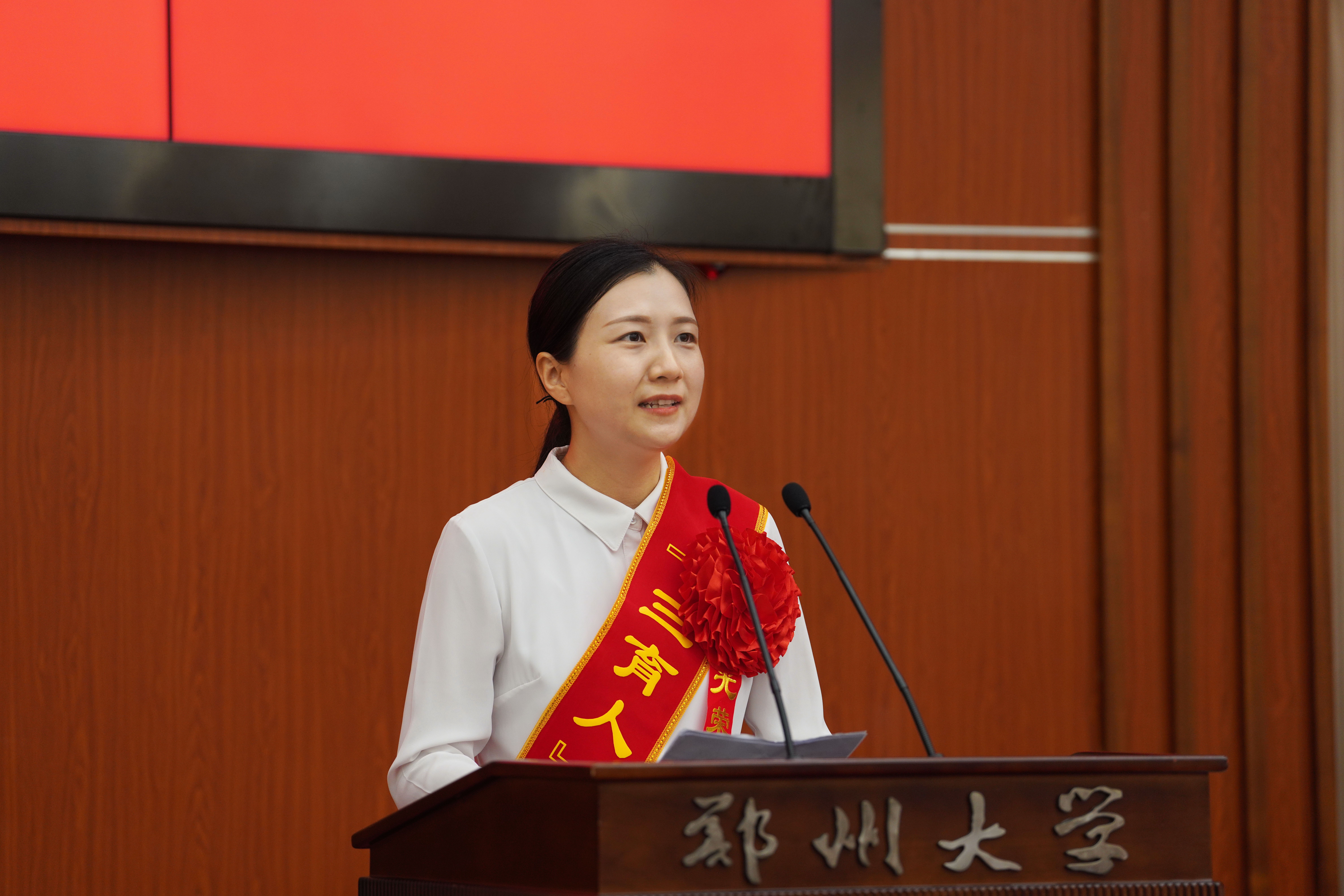 副校长张倩红宣读《关于表彰ac米兰官网中文网站2023-2024学年校级“三育人”先进个人的决定》,校党委常委、副校长胡少伟宣读《关于表彰“教龄满30年教师”的决定》,与会领导为“三育人”先进个人代表颁发荣誉证书。校长李蓬院士为“教龄满30年教师”代表颁发奖杯。材料科学与工程学院田佳佳、基础医学院李翔、后勤保障中心杜道运3位教师分别作典型发言。