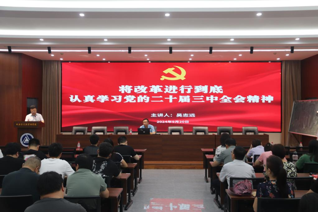 吴志远以《将改革进行到底——学习贯彻党的二十届三中全会精神》为题,从历史、思想引领、现代化逻辑、改革逻辑“四个维度”切入,对党的十一届三中全会至党的二十届三中全会的政策演变进行回顾梳理,带领全体老师和学生党员代表们“全方位”详细解读全会的精神要义,深刻认识全会召开所处的关键时期与全会主题,深入学习领会习近平总书记在党的二十届三中全会上的重要讲话精神。他强调,大家要深刻认识《中共中央关于进一步全面深化改革、推进中国式现代化的决定》的重要性和必要性,全面准确理解《决定》中党和国家对进一步深化改革做出的战略布局、系统部署,全力以赴贯彻落实全会精神,将“学习贯彻全会精神”同“学习领会习近平总书记关于全面深化改革的新思想新观点”相结合,以实现融会贯通。