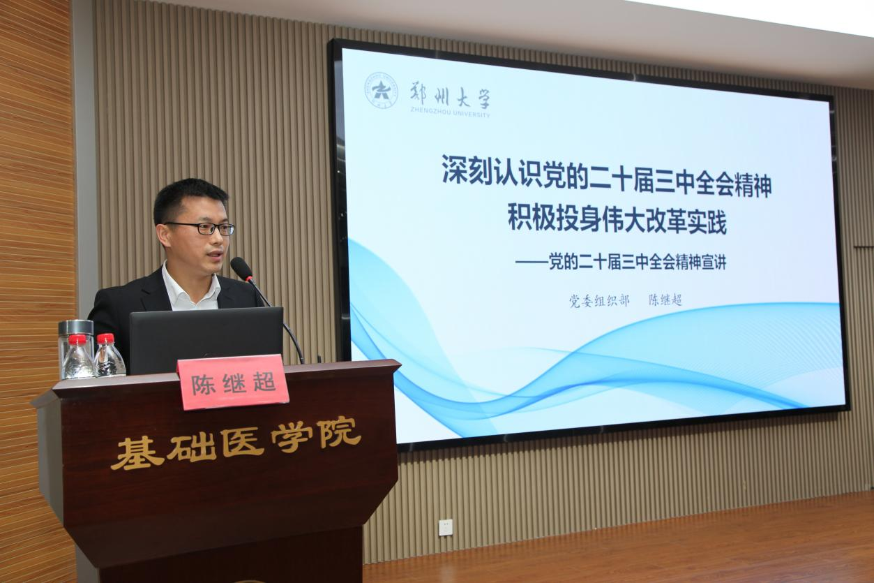 为深入学习贯彻党的二十届三中全会精神,根据校党委统一部署,9月25日,ac米兰官网中文网站学习贯彻党的二十届三中全会精神宣讲团成员、校党委常委、组织部部长陈继超到基础医学院作宣讲报告。学院党政班子成员、全体教职工以及部分学生代表150余人参加。