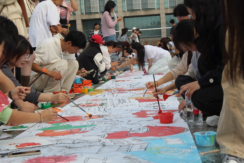 现场气氛热烈,色彩斑斓的颜料与充满创意的画笔交相辉映。画卷两侧挤满了郑大青年积极参与的身影,或蹲或爬,用水粉、丙烯颜料等工具挥笔涂色,同学们专注而认真,争相在画卷上一展风采,以真挚的情感、真实的视角和灵动的笔触,勾勒出心中的祖国山河,鲜艳的牡丹、雄伟的长城、壮丽的天安门……每一幅经典场面都展现着心中浓厚的爱国情怀。