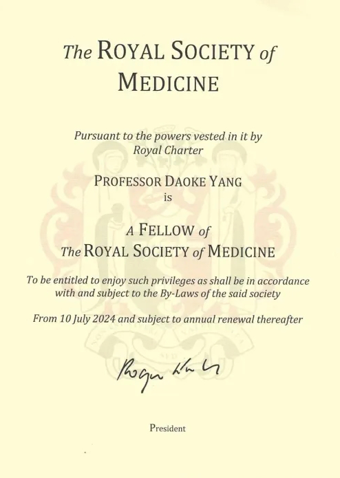 英国皇家医学会是世界上历史悠久、最具影响力的医学学术组织之一,致力于推动医学科学的发展,提升全球医疗服务水平。该学会院士头衔授予在医学领域取得了突出成就的医师和科学家。杨道科教授当选为英国皇家医学会院士,不仅是对其学术成就和重要贡献的高度认可,也是对ac米兰官网中文网站医学教育专业水平和人才培养的高度认可。