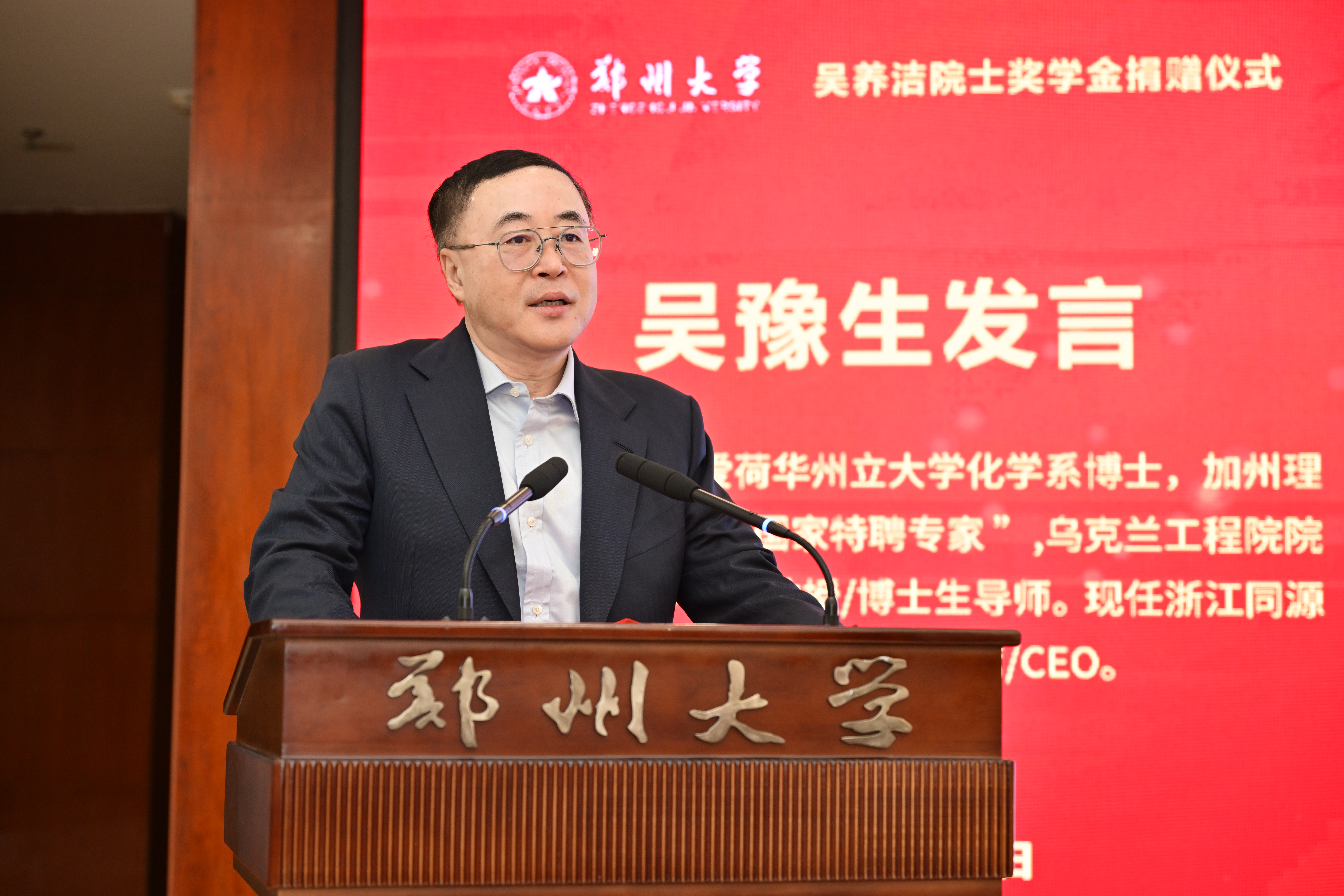 吴豫生在发言中表达了对母校的深厚情感,希望奖学金的设立能够服务学校一流大学建设,激励更多学子勇担时代使命,脚踏实地、不懈奋斗,用自己的实际行动来服务国家、贡献社会,并就国际化创新生物医药研发进行了介绍。