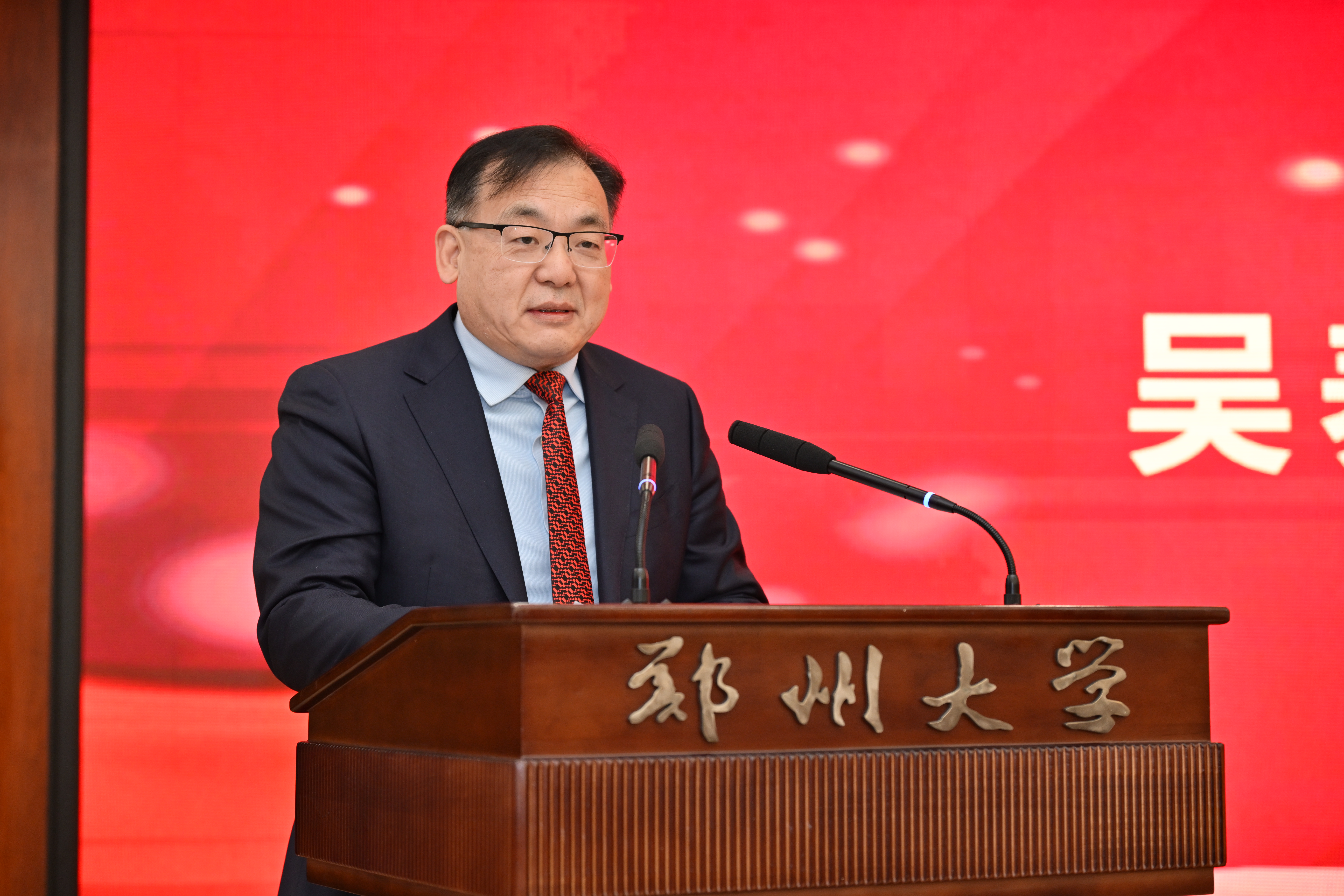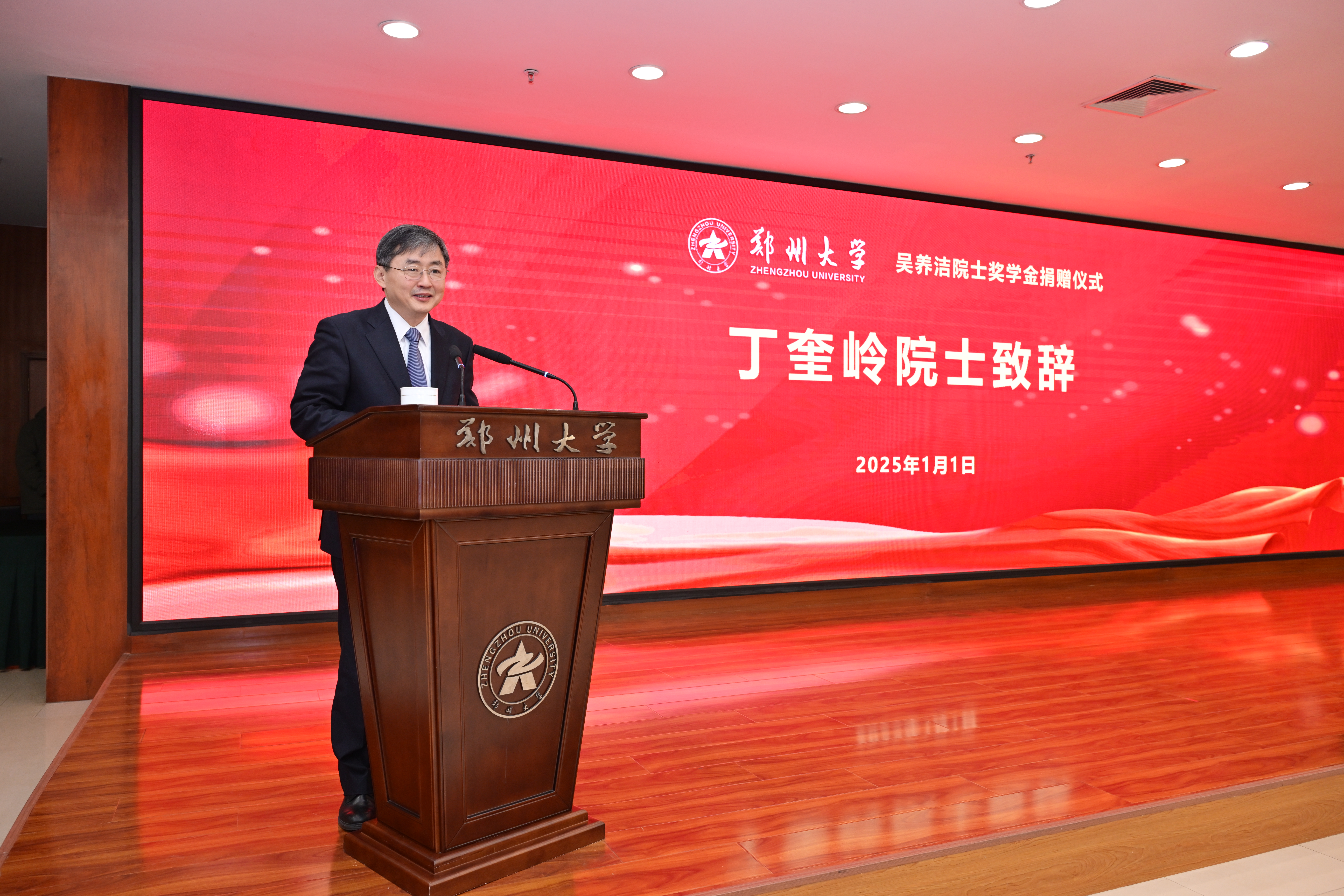 吴养洁在讲话中勉励郑大学子胸怀理想、求是担当、奋力进取、勇攀高峰,为学校发展、强国建设、民族复兴贡献自己的力量。丁奎岭、常俊标分别向吴养洁院士赠送礼品。