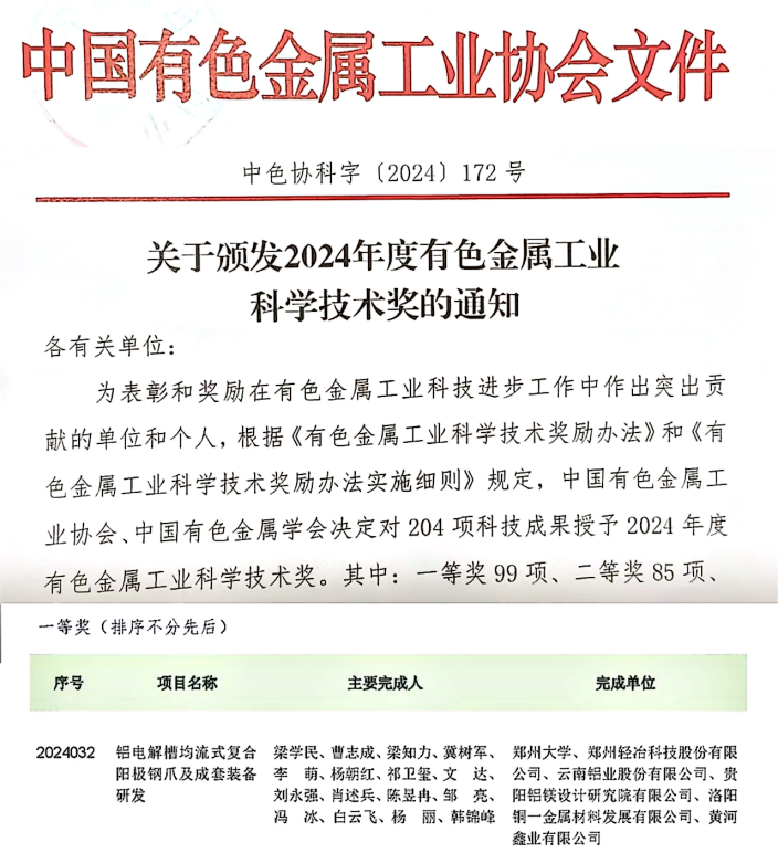 近日,中国有色金属工业协会发布2024年度中国有色金属工业科学技术奖获奖名单。由ac米兰官网中文网站、郑州轻冶科技股份有限公司等联合申报的“铝电解槽均流式复合阳极钢爪及成套装备研发”项目喜获一等奖。