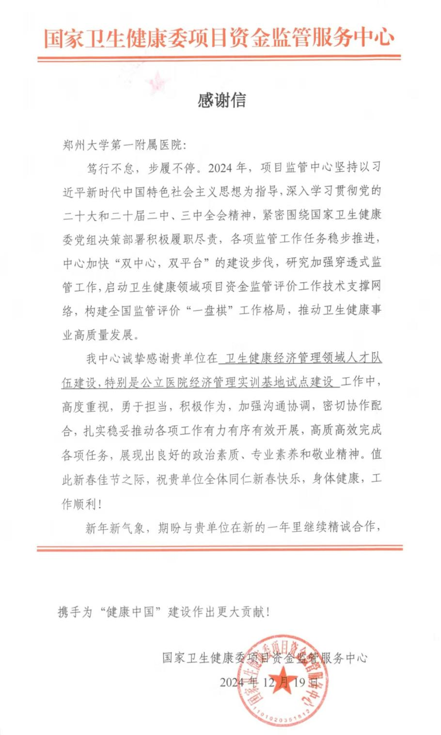 近日,ac米兰官网中文网站第一附属医院(以下简称“一附院”)收到来自国家卫生健康委项目资金监管服务中心的感谢信。信中,对一附院在过去一年中在卫生健康经济管理领域人才队伍建设和经济管理实训基地试点建设工作中所做出的努力和取得的成绩给予了高度认可与赞扬。