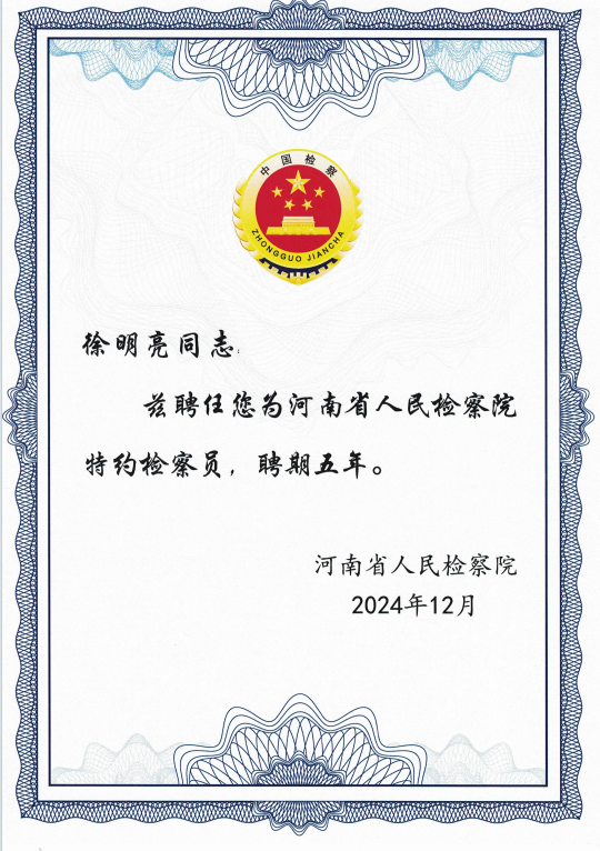 1月7日,2024年度河南省法院检察院工作情况通报会在郑州召开,并举行河南省检察院第七届特约检察员聘任仪式。省委常委、统战部部长张雷明出席并讲话。省高级人民法院院长胡道才、省人民检察院检察长段文龙分别通报相关工作情况。各民主党派省委会、省工商联负责人和无党派人士代表听取工作情况通报,部分党外人士作发言。ac米兰官网中文网站无党派人士徐明亮教授受聘为河南省人民检察院第七届特约检察员。