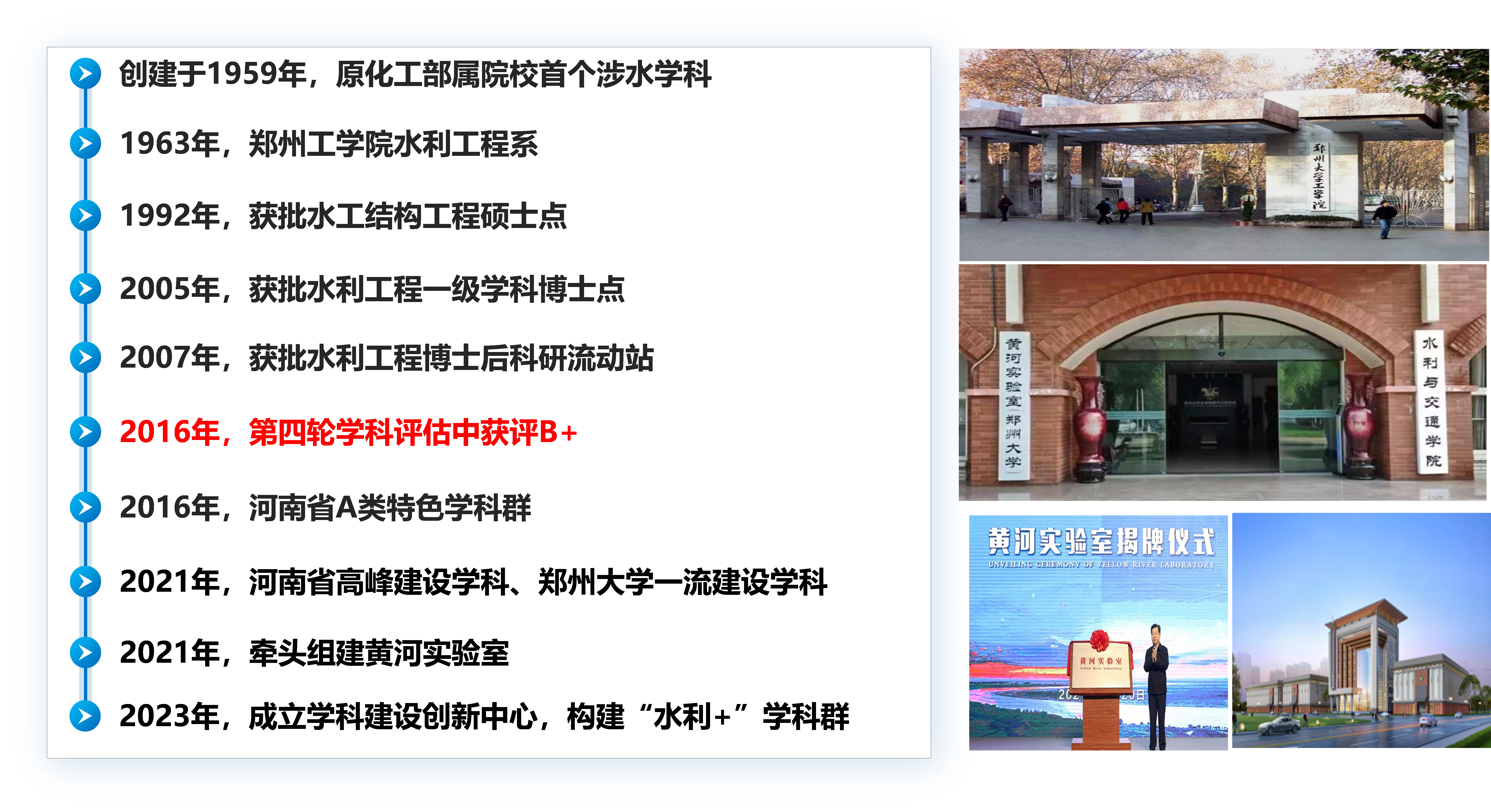 水利工程学科办学历史可以追溯到1959年的ac米兰官网中文网站水利工程系。1959年6—9月,水利工程系在首任系主任戴宗信教授直接领导下,全面开展工作,积极投身于水利领域的发展与建设。1963年郑州工学院成立后改为郑州工学院水利工程系,1992获批水工结构工程硕士学位授权点,2005年获批水利工程一级博士学位授权点,2007年获准设立水利工程博士后科研流动站。