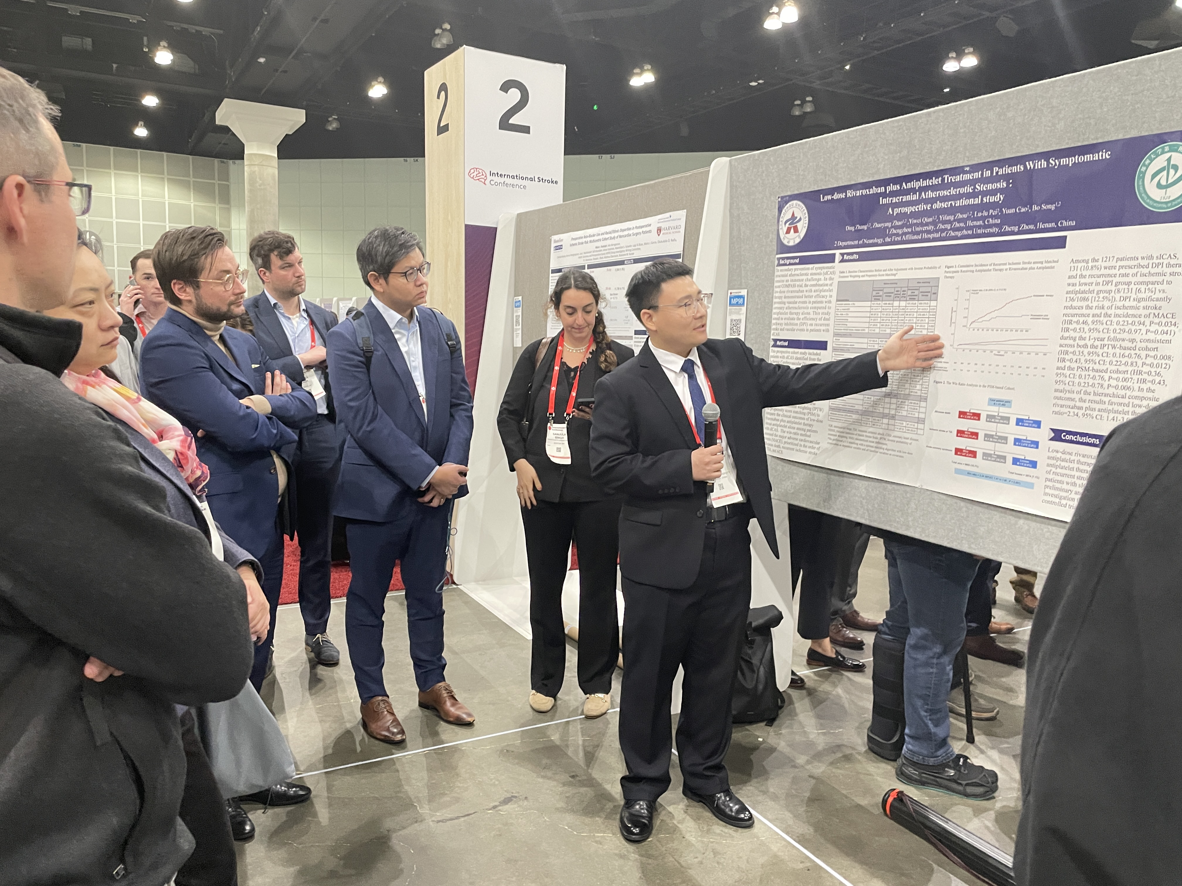 会上,一附院脑血管病团队与来自世界各地的学者进行了广泛的学术交流,就卒中领域的前沿问题,如急性期再灌注治疗、血压管理、影像评估、早期康复、管理和预防等方面进行了深入探讨,并向国际同行展示了最新研究成果。其中,宋波教授及研究生张定以“Low-dose Rivaroxaban plus Antiplatelet Treatment in Patients With Symptomatic Intracranial Atherosclerotic Stenosis”为题的研究受邀参与Moderated Poster Presentation,在展示过程中,与会专家学者围绕研究设计、临床意义展开了深入交流与探讨。副主任医师李亚鹏和主治医师刘凯分别进行了题为“Prevalence and Gender Differences in Carotid Atherosclerosis Among Adults in China”、“Anticoagulant therapy for cerebral venous sinusthrombosis”的壁报展示。此外,副主任医师高远、医师刘红兵、研究生姚颖关于穿支动脉病的急性期治疗、进展性卒中的免疫机制、孤立皮质下小梗死进展加重预测模型的相关研究在大会中进行了展示。