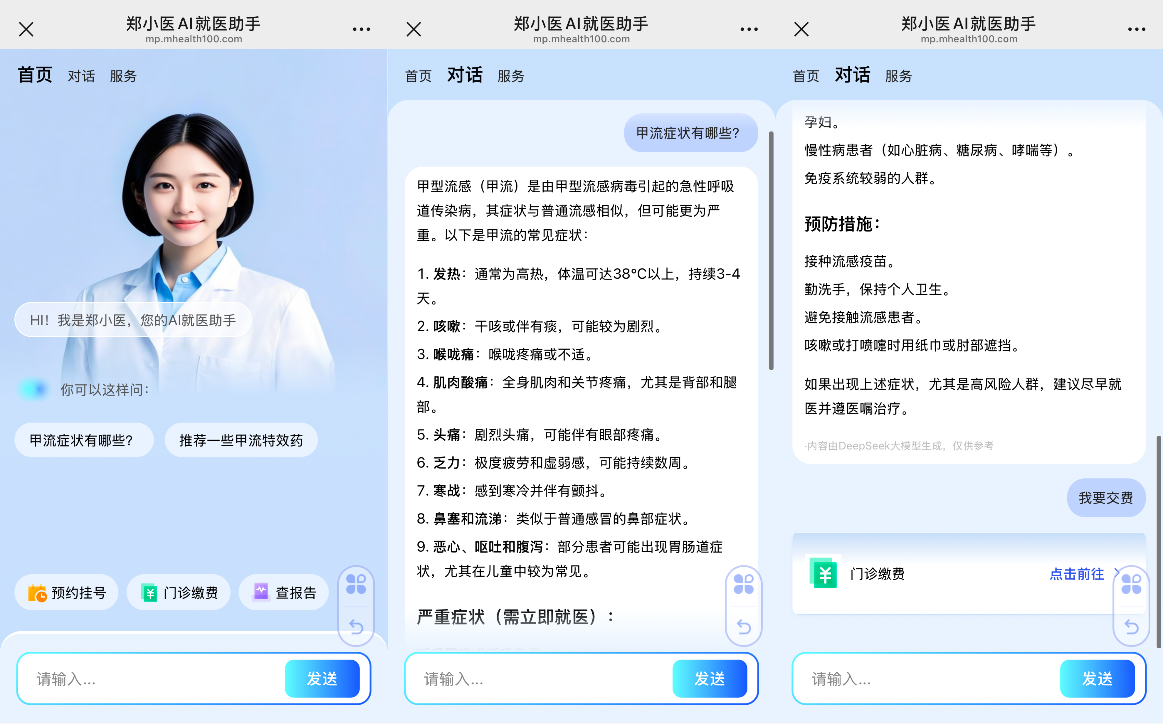 “郑小医AI就医助手”集成了DeepSeek大模型能力,首期推出智能体首页、大模型会话、服务智能唤起、AI就医助手管理端等功能模块,通过与DeepSeek大模型交互,获取患者所关心问题的深度分析结果,智能推荐患者需要的各类服务功能,并根据患者就医需求智能唤起医院已有的门诊、住院、体检、便民、互联网诊疗等多场景移动服务应用,实现患者服务模式由过去GUI交互模式向Chat交互模式转变,将改变过去服务入口多、服务入口分散,服务与内容查找不便等问题。