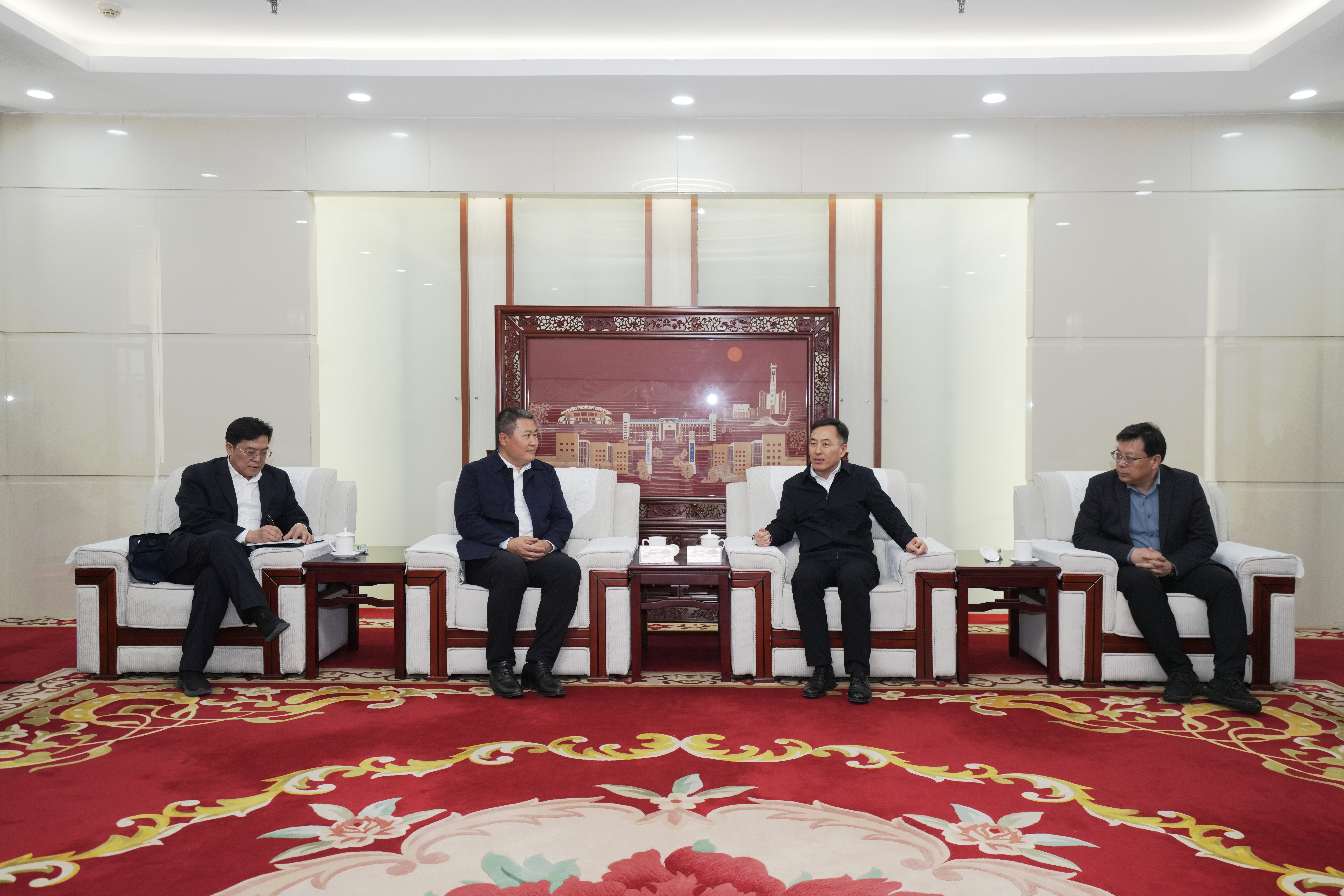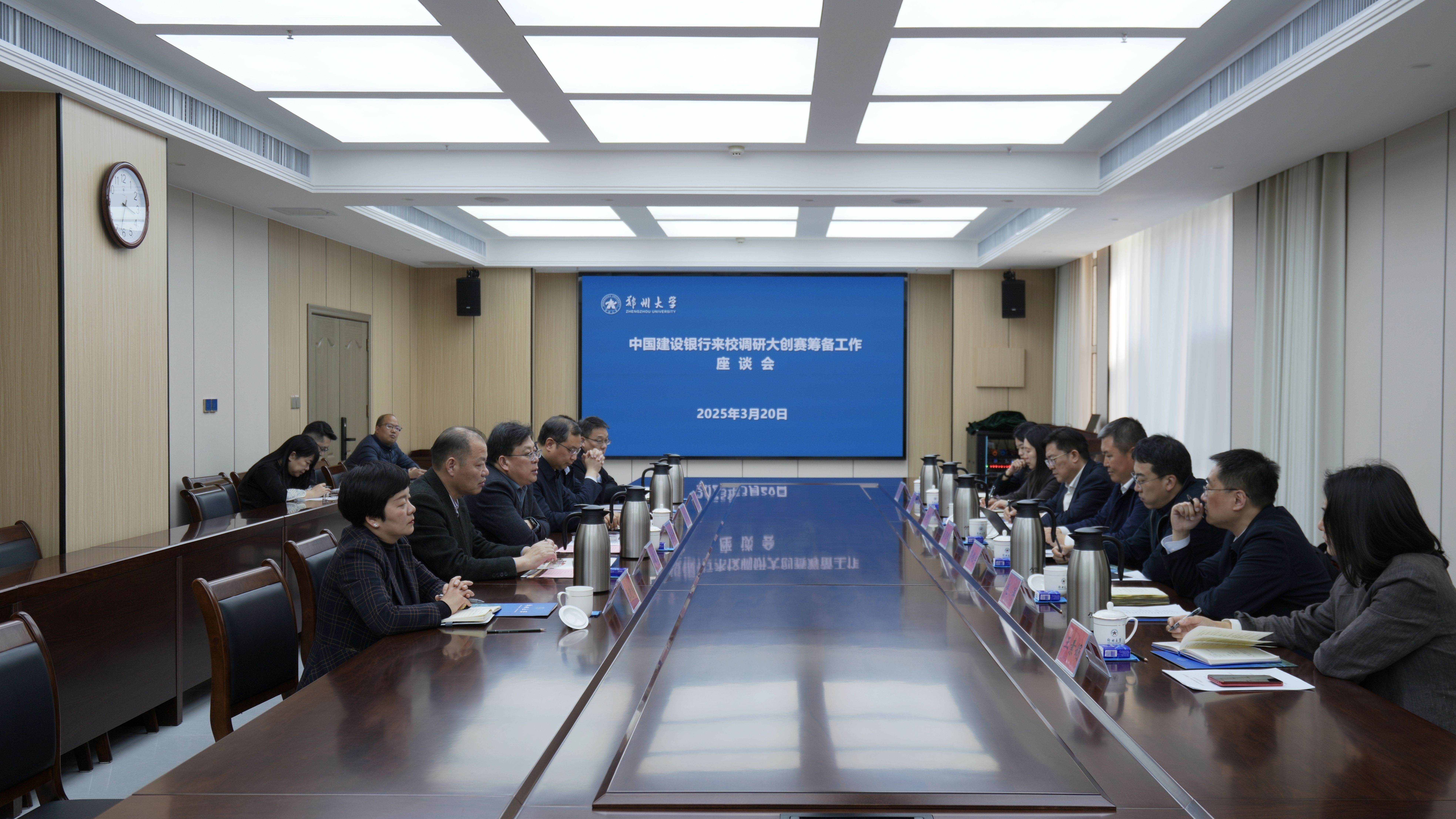 3月20日,中国建设银行总行机构业务部副总经理崔志刚一行来校交流座谈。校党委书记李成伟会见来宾,校党委副书记王利国出席座谈会。中国建设银行总行、河南省分行、郑州金水支行、郑州科技支行,学校党政办公室、教务部、资产与财务部、中国国际大学生创新大赛(2025)专项办公室相关负责同志参加座谈。