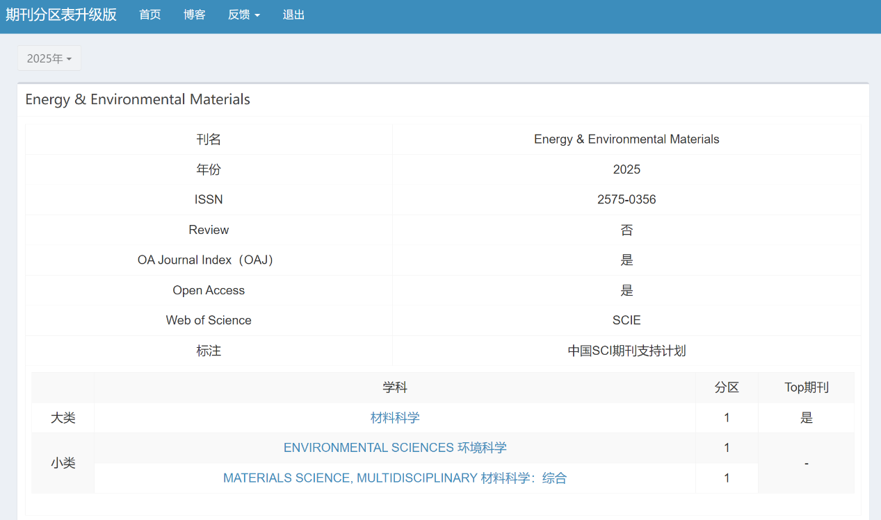 近日,《2025年中国科学院文献情报中心期刊分区表》正式发布,由ac米兰官网中文网站主办的英文学术期刊Energy & Environmental Materials(《能源与环境材料(英文)》,简称EEM)进入材料科学大类:一区TOP期刊。同时,学科小类ENVIRONMENTAL SCIENCES(环境科学)和MATERIALS SCIENCE, MULTIDISCIPLINARY(材料科学:综合)也双双进入一区。