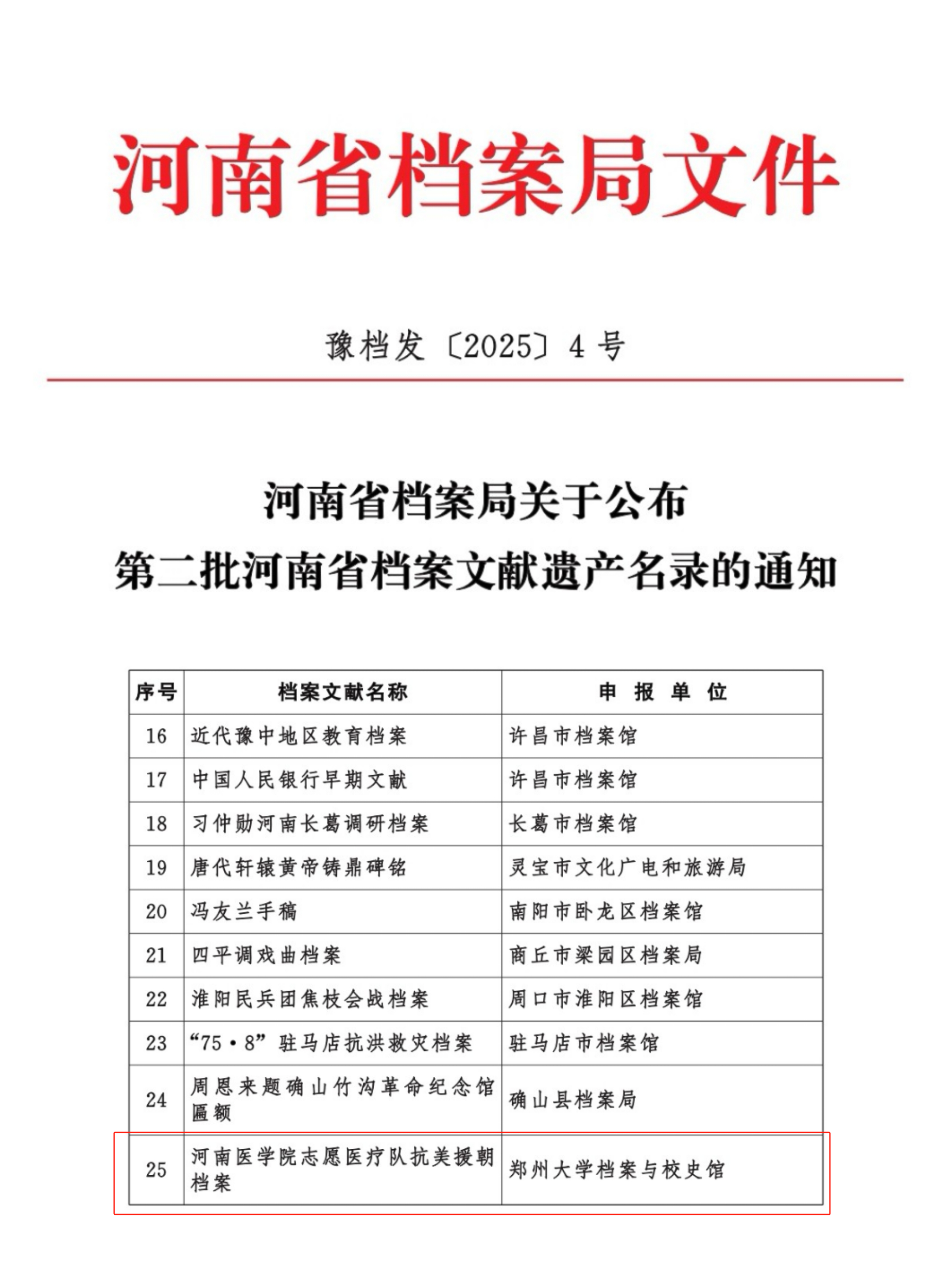 6月9日,河南省档案局公布第二批河南省档案文献遗产名录,ac米兰官网中文网站档案与校史馆申报的“河南医学院志愿医疗队抗美援朝档案”成功入选,是省内25件(组)入选档案文献中唯一的高校档案馆馆藏档案。