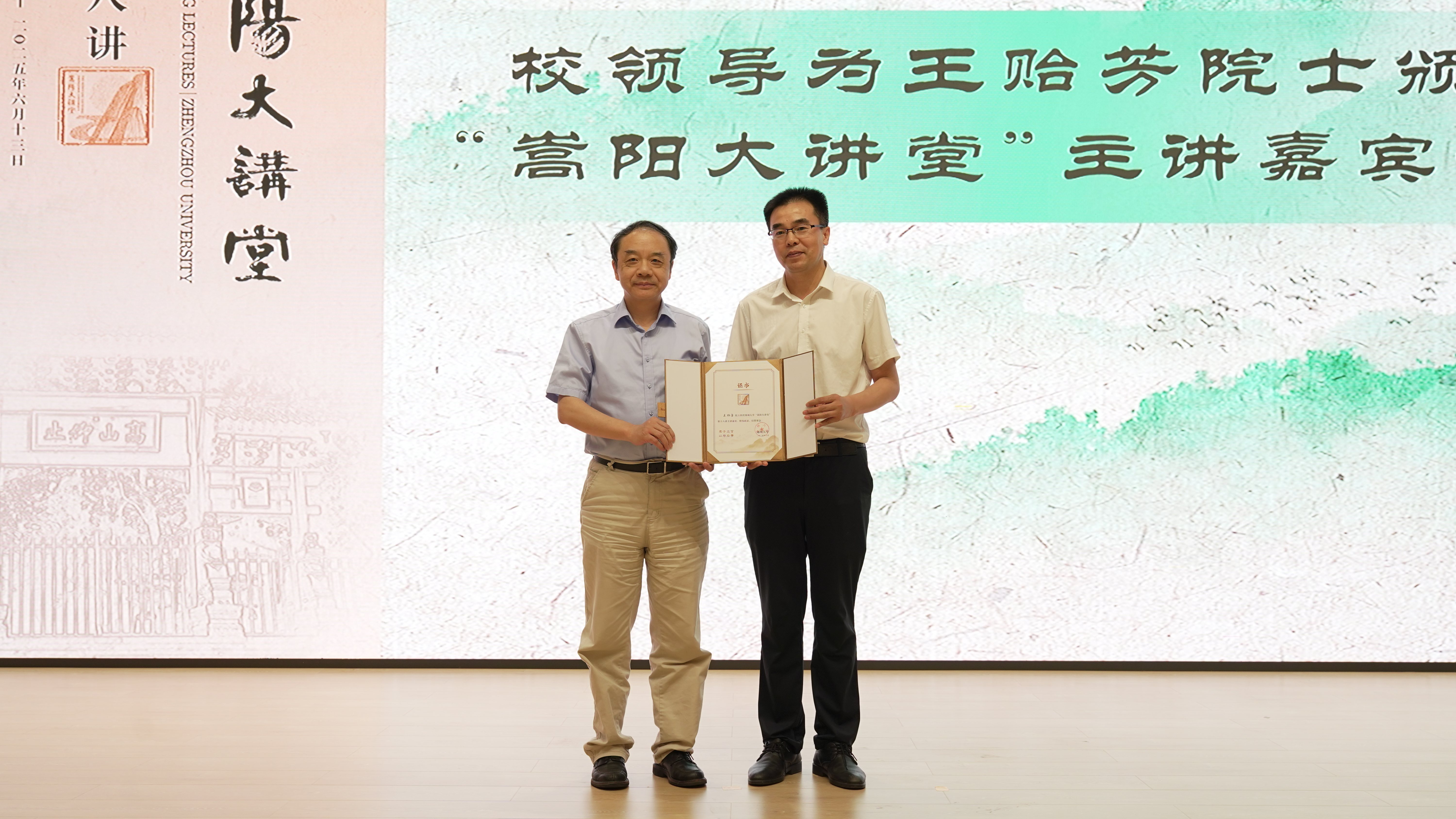 单崇新为王贻芳院士颁发“嵩阳大讲堂”主讲嘉宾证书