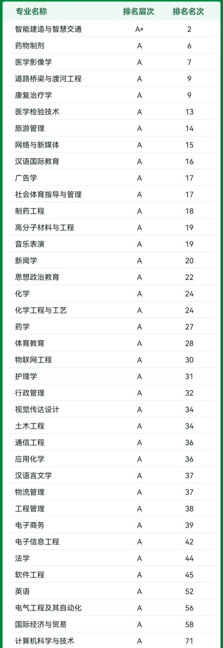 其中,1个专业获评A+,37个专业获评A,56个专业获评B+,8个专业获评B。学校智能建造与智慧交通专业位列全国第2,药物制剂、医学影像学、道路桥梁与渡河工程、康复治疗学、图书馆学、水文与水资源工程、植物科学与技术、儿科学、金融数学、麻醉学、水利水电工程、密码科学与技术、世界史等13个专业位列全国前10。