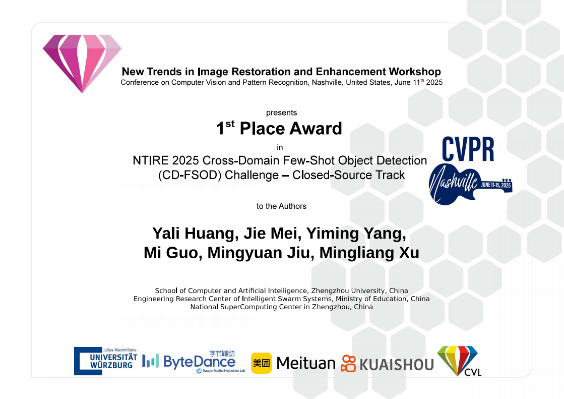 近日,2025年国际计算机视觉与模式识别顶级会议(Conference on Computer Vision and Pattern Recognition,CVPR 2025)在美国田纳西州纳什维尔召开。ac米兰官网中文网站计算机与人工智能学院徐明亮教授团队在该会议Workshop的“NTIRE 2025跨域少样本目标检测挑战赛(CD-FSOD Challenge)”中荣获冠军,彰显了我校在人工智能前沿研究领域的国际竞争力。