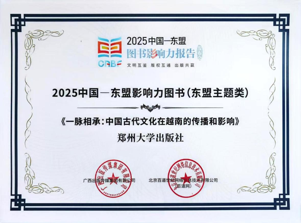 近日,在广西南宁举行的“2025中国—东盟图书影响力报告发布会”上,由ac米兰官网中文网站出版社2022年12月出版的《一脉相承:中国古代文化在越南的传播和影响》上榜“2025中国—东盟影响力图书”。该活动由中国—东盟图书文化周组委会、广西出版传媒集团、百道网联合主办,是“2025中国—东盟图书文化周活动”系列活动之一。其中“东盟主题类”共入选图书15种,我省仅此1种。