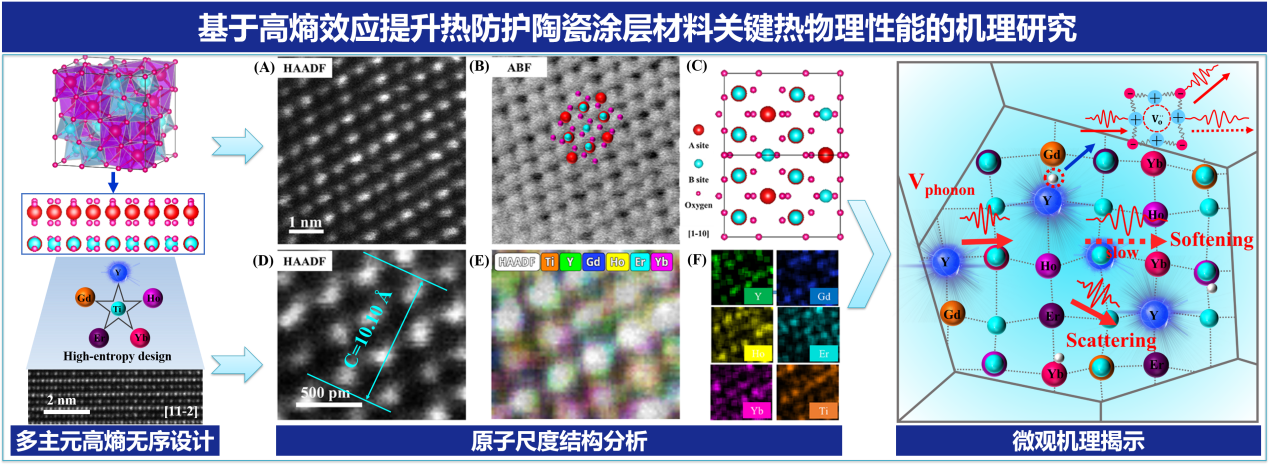 随着高温应用环境日益苛刻,传统涂层材料在进一步降低热导率和提升高温热稳定性方面面临巨大挑战,已成为天空飞行器装备热端部件表面防护涂层材料研发亟须突破的关键瓶颈。高熵效应赋予先进材料优异的热物理性能,使新型高熵陶瓷涂层在热防护领域展现出极大的应用潜力。我校先进陶瓷研究团队基于尺寸无序和质量无序的创新设计思路,成功研发出兼具低热导率与优异高温热稳定性的新型高熵稀土钛酸盐涂层材料,并率先在原子尺度揭示了高熵晶格畸变效应如何进一步降低热导率的深层机制,为极端环境用新型高温热防护涂层的研发开辟了新路径。相关成果于2023年以“High-entropy rare earth titanates with low thermal conductivity designed by lattice distortion”为题发表在Journal of the American Ceramic Society期刊,该工作引起了国内外同行的热切关注。