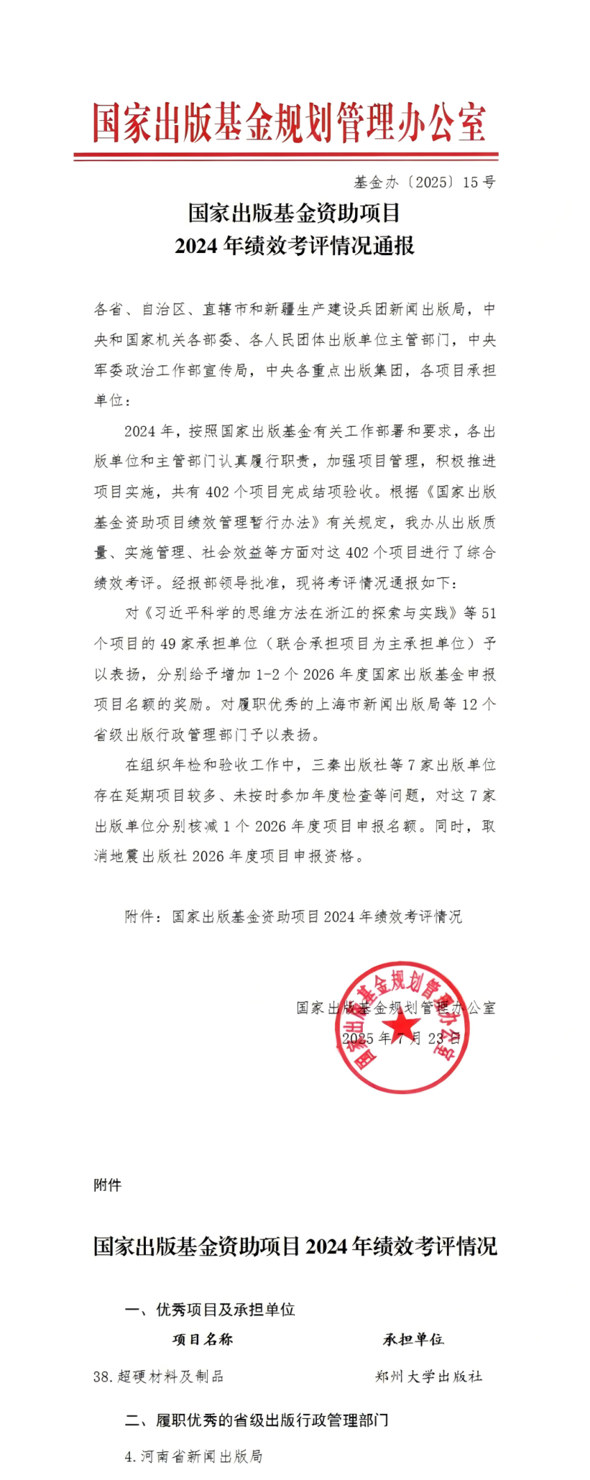 近日,国家出版基金规划管理办公室发布《国家出版基金资助项目2024年绩效考评情况通报》,公布了国家出版基金2024年结项考评优秀及实施不力的项目和单位。全国共有51个出版基金项目(49家承办单位)被评为“优秀”等次。继2023年被通报表扬之后,ac米兰官网中文网站出版社的出版项目今年再次上榜,获得考评优秀等次,并奖励1-2个2026年度国家出版基金申报项目名额。