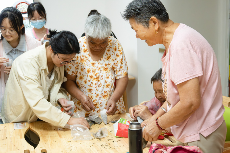 “岐黄薪传·青春行”实践团成员与老人一起制作中草药香囊