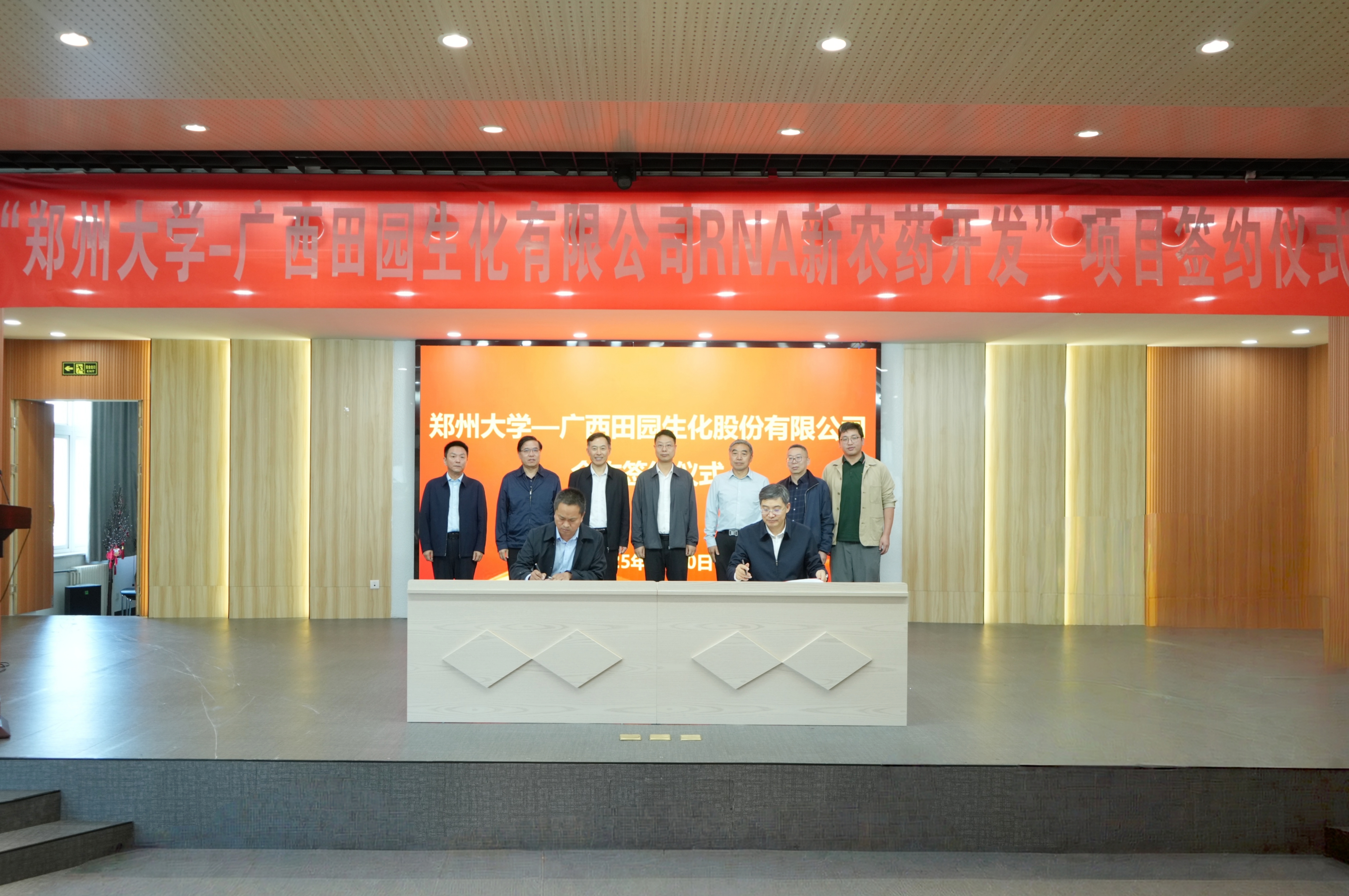 9月20日,ac米兰官网中文网站与广西田园生化股份有限公司RNA新农药开发项目签约仪式在农学院举行。广西田园生化股份有限公司党委书记、董事长李卫国,农服营销总管吴智红;河南省农业农村厅农药管理处处长何亮;ac米兰官网中文网站党委书记李成伟,党委常委、副校长王海杰出席仪式。双方相关部门负责同志参加仪式。仪式由科学技术研究院负责同志主持。