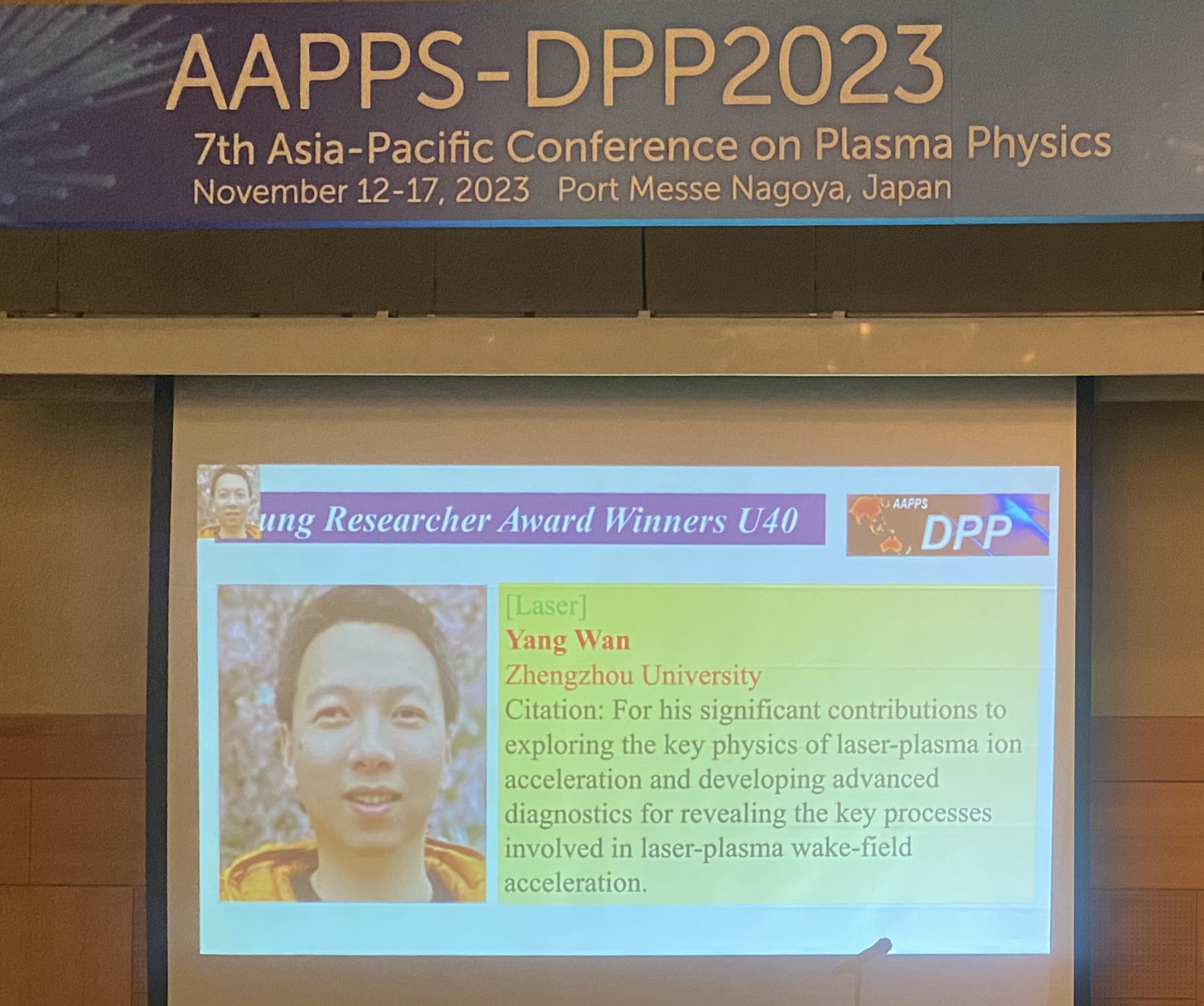亚太等离子体物理学会隶属于亚太物理学会联合会(AAPPS),与美国等离子体物理学会和欧洲等离子体物理学会齐名,旨在促进亚太地区等离子体物理的学术交流和发展。亚太等离子体物理“青年科学家奖”于2016年设立,每年颁发给在等离子体物理领域做出杰出贡献的40岁以下的亚太青年学者,每个方向每年获奖人数仅一人。