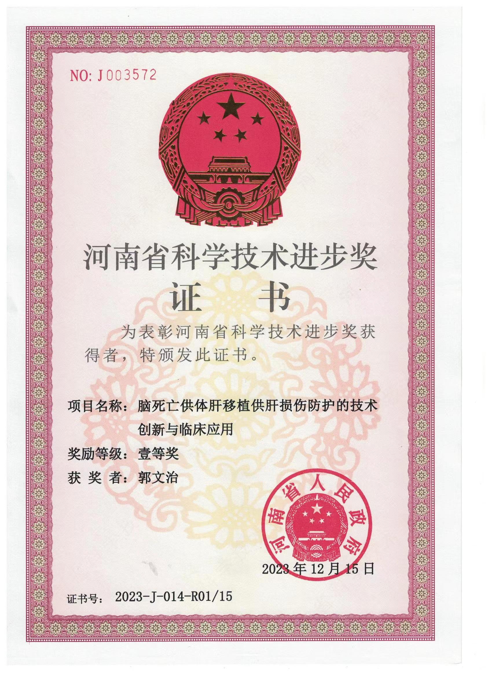 针对这一问题,郭文治带领团队进行深入研究和探索,历经19年,通过临床标本和数据分析、动物模型和分子生物学等技术和方法,创新性地提出了一系列保护供肝的技术和方法,有效地降低了供肝损伤的发生率,提高了移植手术的成功率,研究项目《脑死亡供体肝移植供肝损伤防护的技术创新与临床应用》,也荣获2023年度河南省科学技术进步奖一等奖。