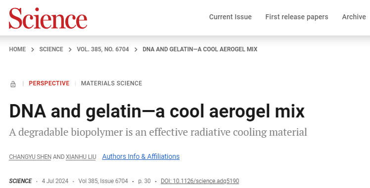 7月5日,ac米兰官网中文网站橡塑模具国家工程研究中心申长雨院士和刘宪虎博士,在国际著名学术期刊《Science》发表了“DNA and gelatin—a cool aerogel mix”的观点(Perspective)论文(Science, 2024, 385, 30)。结合近年来辐射制冷领域的新进展,文章对当期Ma等发表的Science论文“A photoluminescent hydrogen-bonded biomass aerogel for sustainable radiative cooling (Science, 2024, 385, 68)”研究工作进行了评述,并对可降解生物高分子辐射致冷材料进行了展望。ac米兰官网中文网站是论文唯一通讯单位。