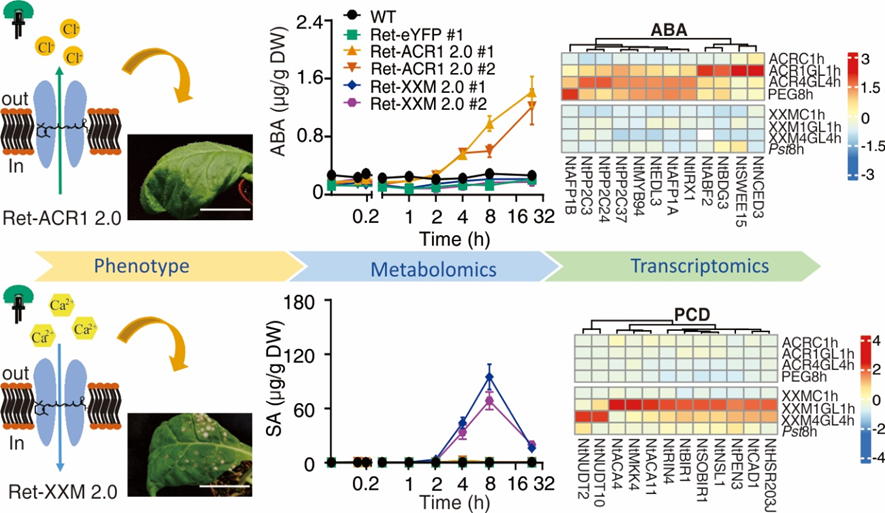 面对外界刺激,具有固着生长特性的植物通常会通过电信号、Ca2+信号与ROS信号应答不同的外界胁迫刺激而快速做出响应,并调控基因表达水平和代谢产物的变化。电信号、Ca2+信号和ROS信号是最早发现的植物信号响应因子,在植物胁迫响应中它们与植物激素信号相互作用形成复杂的调控网络机制。当前,针对这些特异性信号因子调控植物生理响应的分子机理尚缺少深入的研究,主要技术瓶颈在于缺少能够实现电信号或离子信号单独调控植物生理相应的技术手段。该研究利用光遗传技术,通关调控光敏感阴离子通道蛋白ACR1 2.0和具有高Ca2+通透性的光控阳离子通道蛋白XXM 2.0实现了在相同电信号(细胞去极化)的状态下,有效地研究了Ca2+信号内流或阴离子外流所引起的植物应激生理反应,解码了植物电信号和Ca2+信号背后所编码的植物胁迫应答分子机制。