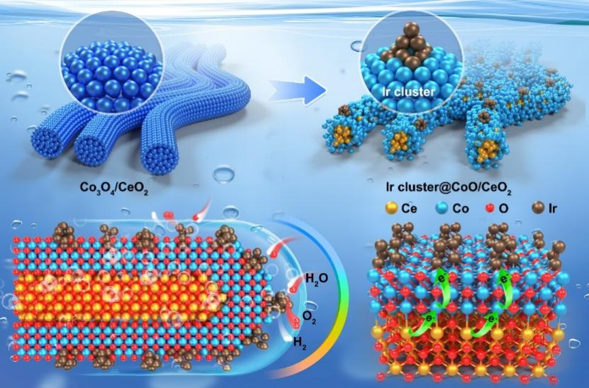 构建活性原子几乎完全暴露的亚纳米团簇催化剂是同时提高原子利用效率和活性的一条很有潜力的途径。虽然在合成亚纳米团簇方面已经进行了大量的研究,但控制金属团簇在指定的载体上的均匀可控分布仍然存在困难,特别是在高金属负载的情况下。寻找一种可行的策略来防止金属团簇在合成和反应过程中聚集成纳米颗粒仍然是研究的重点。因为载体表面性质对金属前体分子的吸附/分散和生成的簇的稳定性起着不可或缺的作用。因此,设计合适的支撑材料,使其高度稳定,并与金属团簇相互作用,以防止金属聚集是突破之一。金属氧化物作为亚纳米金属团簇的载体,在碱性条件下具有良好的结构稳定性,但在酸性和中性条件下催化水分解的耐久性不足。此外,核壳结构的实现有可能优化转运-反应权衡,有效利用催化活性物质,从而提高催化剂的催化性能。基于此,该团队通过受限原位外溶策略构建了一种核壳钴铈双金属氧化物,表面是高覆盖亚纳米级Ir团簇(Ir cluster@CoO/CeO2)。该催化剂在宽pH范围内表现出优异的电解水性能。