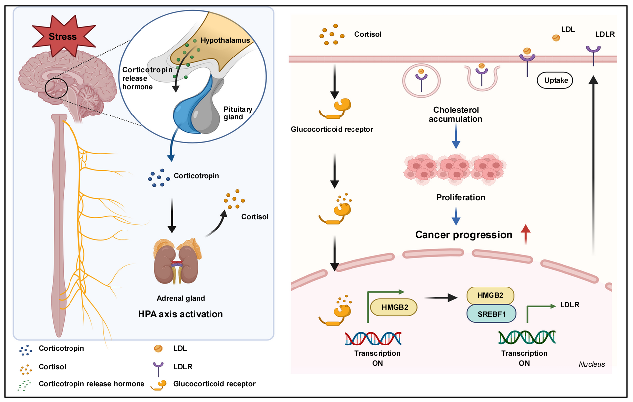 机制图:慢性压力通过释放皮质醇激活GCR-HMGB2-LDLR轴,导致胆固醇代谢异常,促进ESCC的发生和发展。
