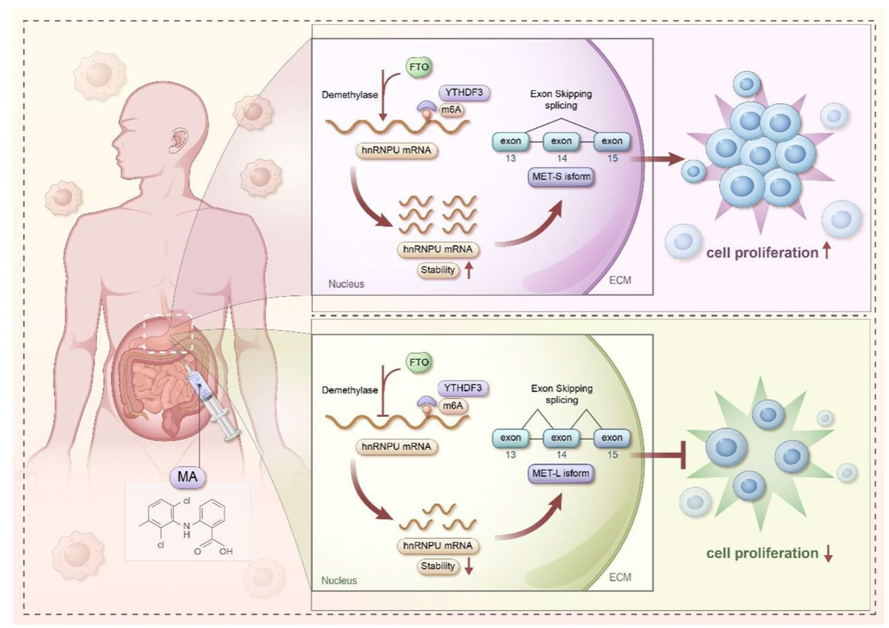 机制图:FTO通过调节HNRNPU的甲基化水平影响MET的可变剪切促进胃癌的发生