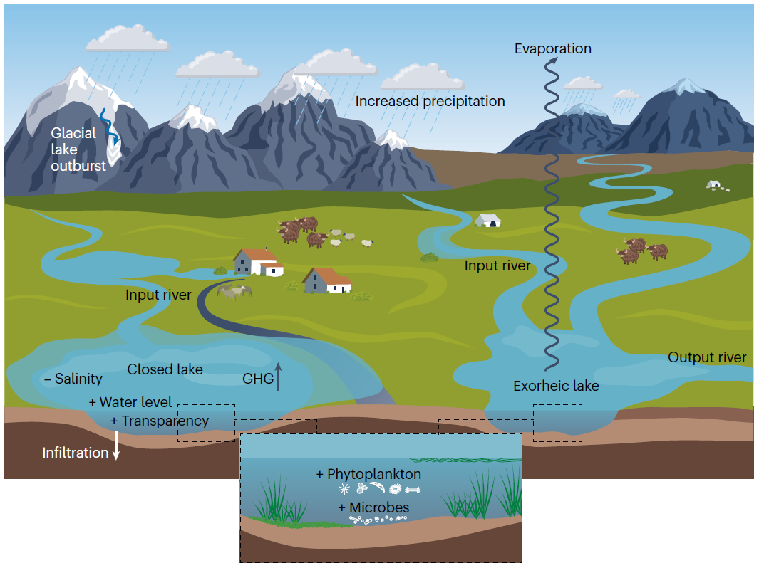 为全面研究青藏高原湖泊对气候变化的响应和影响,ac米兰官网中文网站地球科学与技术学院副教授乔宝晋与中国科学院青藏高原研究所研究员朱立平团队合作,通过大量的实地调查和遥感反演分析发现,随着气候变暖,青藏高原湖泊的规模、物理和生物地球化学特征发生了明显的变化。自1995年以来,湖泊面积和体积持续增加,北部湖泊扩张最快,大中型湖泊(≥10 km2)平均地表温度快速升高。水体平均透明度增加,平均盐度下降,平均叶绿素下降,这些变化均表现为北部变化幅度高于南部。尽管外部营养成分输入仍然较少,浮游植物生产力增加有限,但湖泊生物地球化学的响应仍表现为微生物多样性和营养状况增强。虽然青藏高原的湖泊是大气CO2的源,但全年观测表明,湖泊仍可能是CO2的汇,盐度较高的湖泊比盐度较低的湖泊向大气排放的二氧化碳更强。