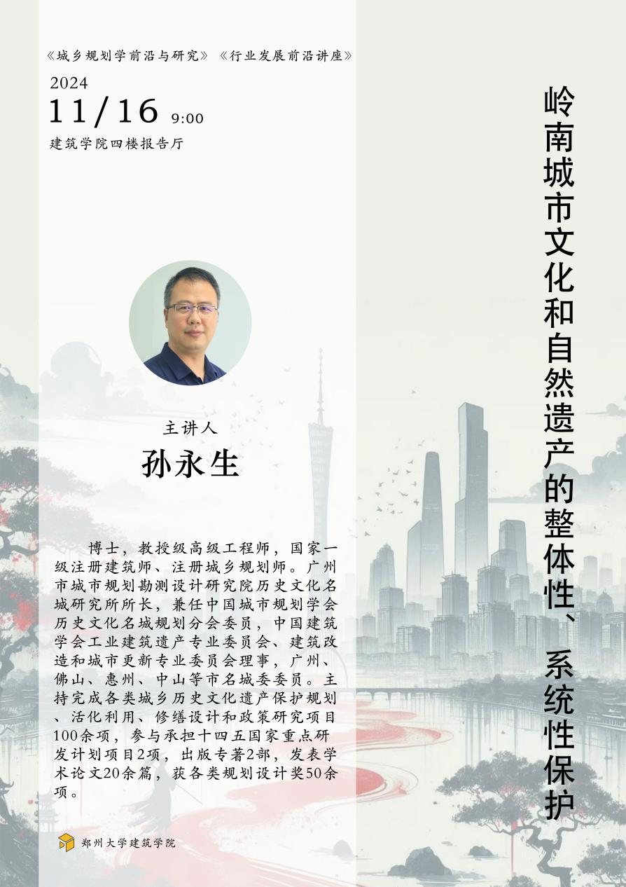 为提升城乡规划与建筑学研究生的专业素养,关注城乡发展和文化遗产保护的前沿问题,ac米兰官网中文网站建筑学院特邀广州市城市规划勘测设计研究院历史文化名城研究所所长孙永生开展“岭南城市文化和自然遗产的整体性、系统性保护“讲座,就岭南地区历史变迁与流域保护,山水名城传承与城市风貌塑造,历史水系修复与沿线街区保护更新等内容进行分享,敬请各位师生莅临。