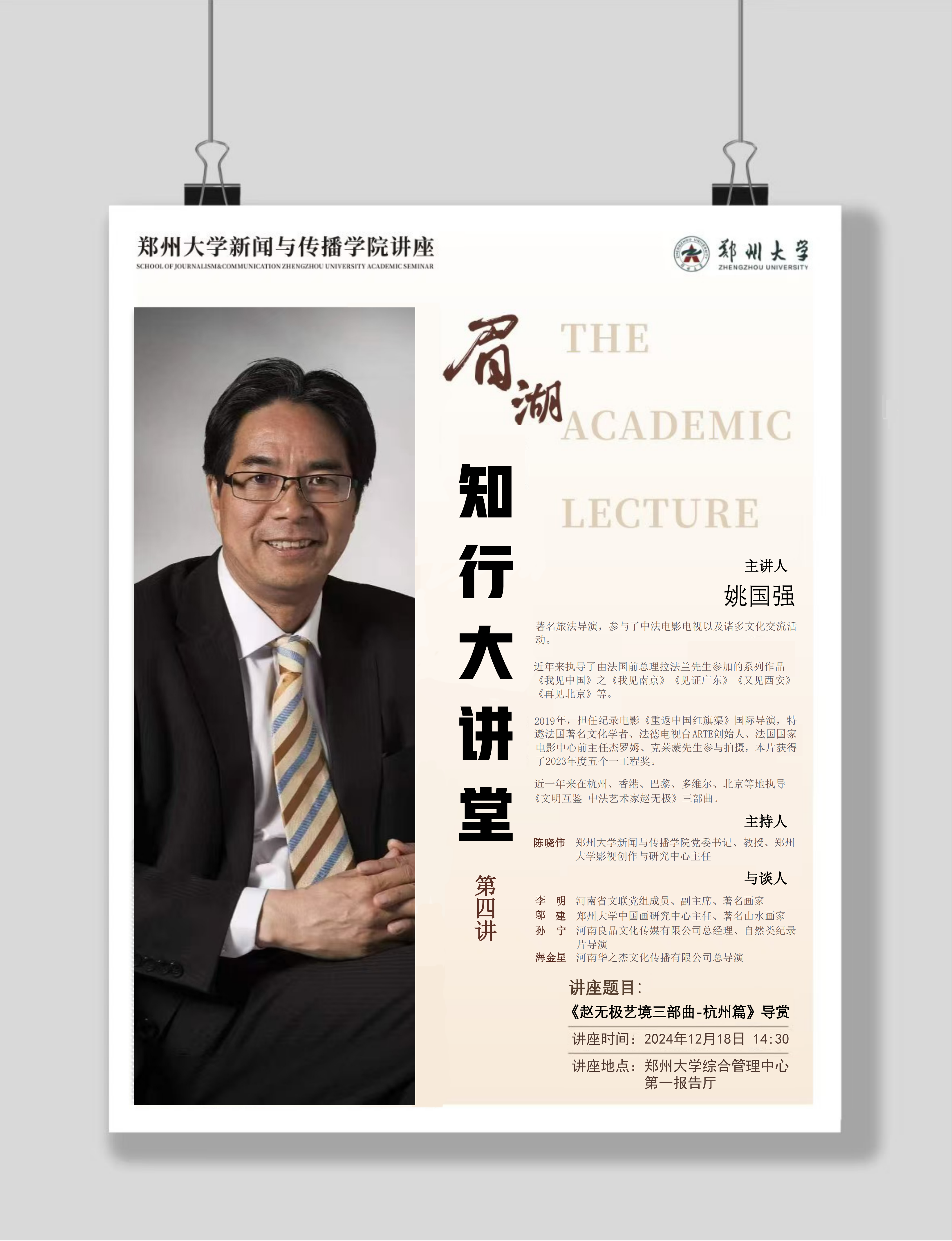 ac米兰官网中文网站新闻与传播学院眉湖·知行大讲堂是一个汇集知识、人文、艺术于一体的交流平台,定位以文化人,审美向善。第四期邀请了著名旅法导演姚国强先生携纪录片作品《赵无极艺境三部曲》前来交流并做现场导赏,欢迎广大师生积极参加!
