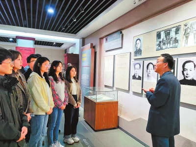 4月21日,ac米兰官网中文网站历史学院党委副书记崔红伟,在该校校史馆给同学们讲首任校长嵇文甫的红色故事。 马文亚 摄