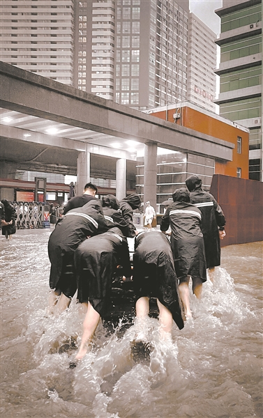 7月20日,铁道警察学院师生正在封堵涌入校门的雨水。何宁川 摄