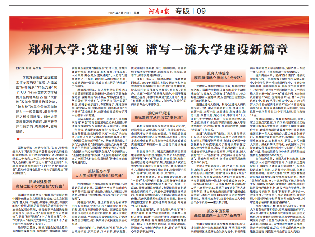 ac米兰官网中文网站第三次党代会召开以来,学校党委深入学习贯彻习近平总书记关于党的建设的重要思想、关于教育的重要论述,贯彻落实党的二十大和二十届三中全会精神、全国教育大会精神,胸怀“国之大者”“省之要者”,以高质量党建引领学校“十四五”书写“出彩答卷”,推动中国特色世界一流大学建设跑出“郑大加速度”。