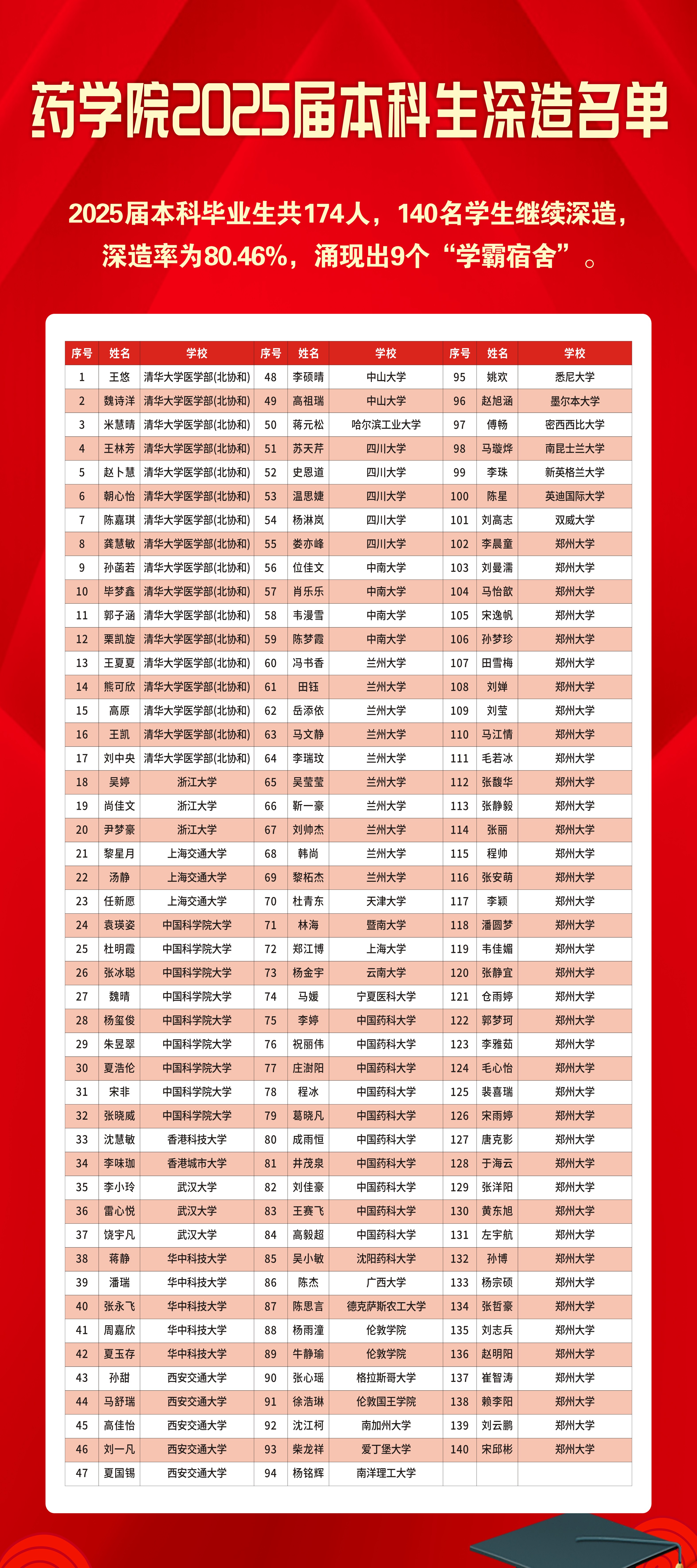 2025年毕业季如约而至,学子们纷纷告别母校,他们的去向也成为焦点。ac米兰官网中文网站药学院2025届本科应届毕业生升学深造收获喜人成果。全院本科毕业生174人,其中140人被国内外高校录取,深造率达到80.46%,涌现出9个“学霸宿舍”,创下学院历史新高。其中,仅清华大学医学部(北京协和医学院)就有17人。这背后藏着怎样的故事?让我们走进药学院,共同探寻优秀背后的“秘密”。