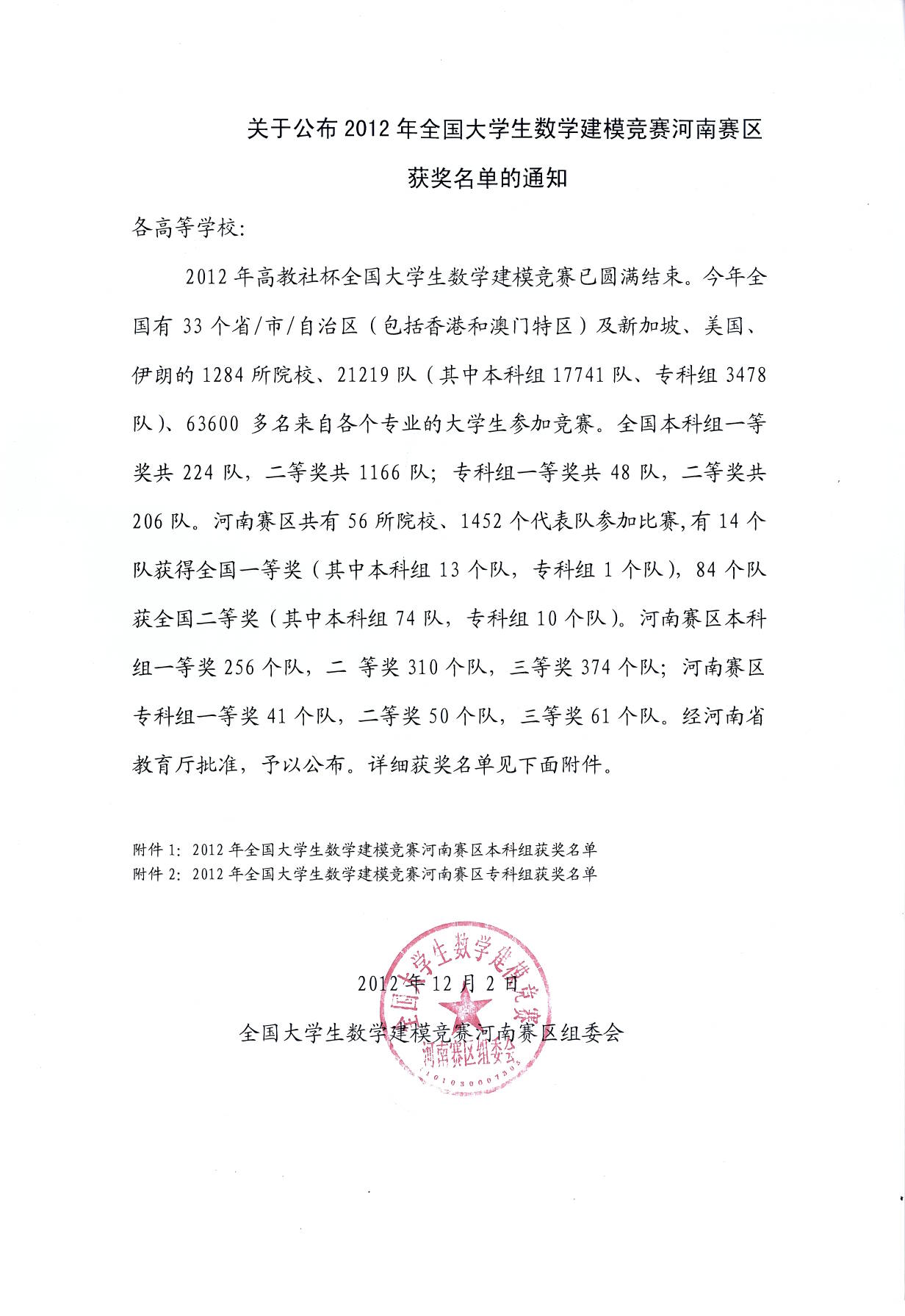2012年高教社杯全国大学生数学建模竞赛已圆满结束。今年全国有33个省/市/自治区(包括香港和澳门特区)及新加坡、美国、伊朗的1284所院校、21219队(其中本科组17741队、专科组3478队)、63600多名来自各个专业的大学生参加竞赛。全国本科组一等奖共224队,二等奖共1166队;专科组一等奖共48队,二等奖共206队。经河南省教育厅批准,河南赛区共有56所院校、1452个代表队参加比赛,有14个队获得全国一等奖(其中本科组13个队,专科组1个队),84个队获全国二等奖(其中本科组74队,专科组10个队)。河南赛区本科组一等奖256个队,二 等奖310个队,三等奖374个队;河南赛区专科组一等奖41个队,二等奖50个队,三等奖61个队。经省教育厅批准,予以公布。详细获奖名单见下面附件。