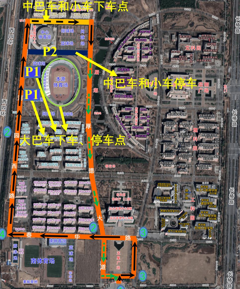 二、9月20日至22日校内交通管制区域和路段为:南门至天健大道,左转到春华路,从河园西路到中心体育馆西门、厚德大道,以及中心体育馆和本源体育场附近所有停车区域等路段实行交通管制(具体内容和路线见附图)。