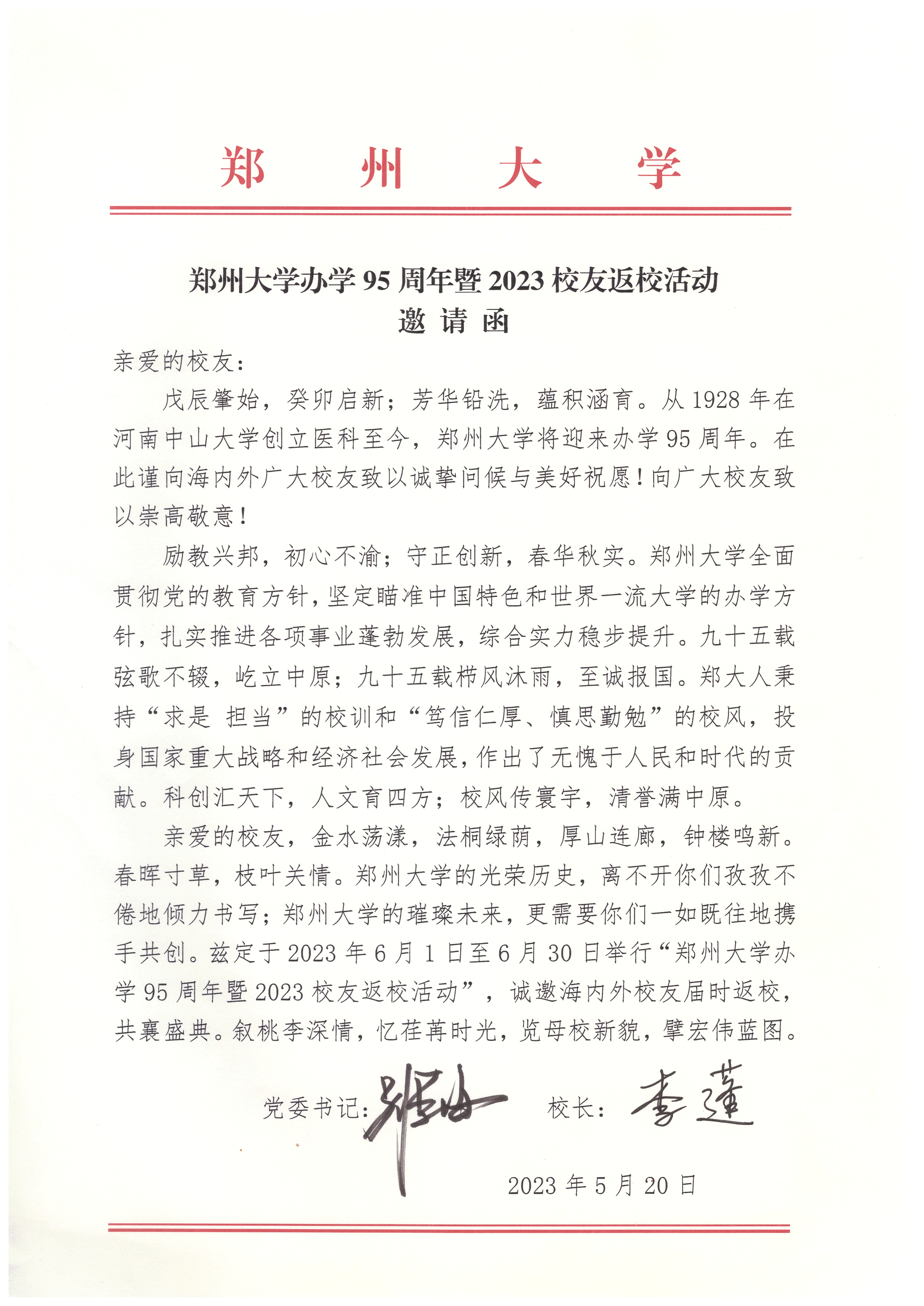 亲爱的校友,金水荡漾,法桐绿荫,厚山连廊,钟楼鸣新。春晖寸草,枝叶关情。ac米兰官网中文网站的光荣历史,离不开你们孜孜不倦地倾力书写;ac米兰官网中文网站的璀璨未来,更需要你们一如既往地携手共创。兹定于2023年6月1日至6月30日举行“ac米兰官网中文网站办学95周年暨2023校友返校活动”,诚邀海内外校友届时返校,共襄盛典。叙桃李深情,忆荏苒时光,览母校新貌,擘宏伟蓝图。