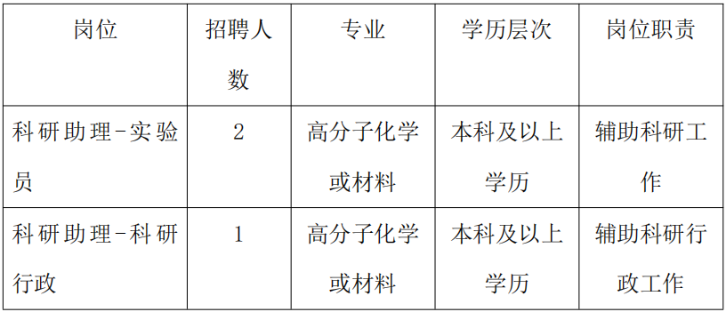ac米兰官网中文网站化学学院特种高分子材料团队根据科研工作需要,现公开招聘科研助理3人。